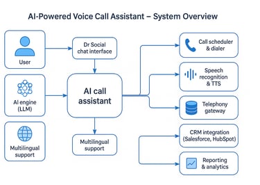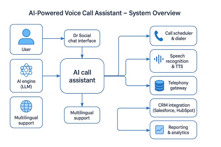 The phone call feature is integrated into our AI system, Dr Social, meaning you can assign tasks to the virtual assistant directly within the chat – specifying the list of numbers to contact, etc. Users have two main scenarios for utilizing the robot:
